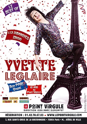 La majestueuse Yvette Leglaire fête cette année ses 10 ans de succès au Point Virgule! À cette occasion, elle vous propose un florilège de ses plus étonnantes interprétations. Toujours accompagnée par son fidèle pianiste et son danseur, le fameux Pedro, venez découvrir ou redécouvrir la plus attachante des chanteuses réalistes et surréalistes de notre époque! Dernière diva de la chanson française... Yvette Leglaire et ses 75 ans de carrière, c'est un mythe, un peu mité, souvent imitée, mais jamais égalée!