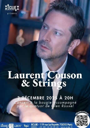 À l’occasion de la sortie en exclusivité de son nouvel album Neo Classical Suite, le pianiste, compositeur et chef d’orchestre Laurent Couson offre à l’ECUJE un concert exceptionnel, accompagné du quatuor à cordes du violoniste virtuose Glen Rouxel. Formé au Conservatoire Supérieur de Paris et lauréat de multiples distinctions, Laurent Couson s’est imposé sur les plus grandes scènes – de la Salle Pleyel au Carnegie Hall de New York – et a dirigé de prestigieux orchestres à travers le monde. Collaborateur de Claude Lelouch, Luc Besson, Dee Dee Bridgewater ou Charles Aznavour, il incarne cette génération d’artistes qui réconcilie musique classique, jazz et émotion cinématographique.