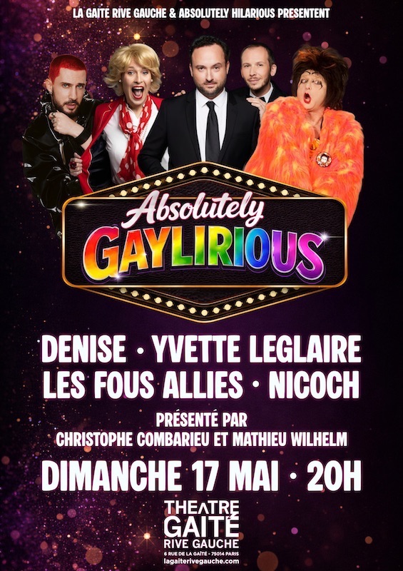 Un rendez-vous queer incontournable, une soirée haute en couleurs et en liberté où se mêlent stand-up, personnages, et performances déjantées. Un moment de fête et de grand délire, où les barrières des différences volent en éclat, avec un seul objectif : le rire! Absolutely Gaylirious, le dimanche 17 mai, à l'occasion de la journée internationale de lutte contre l'homophobie, la transphobie et la biphobie.