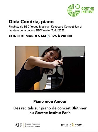 La pianiste roumano‑irlandaise Dida Condria, âgée de 22 ans, poursuit actuellement un master au Royal College of Music de Londres, qu’elle effectue grâce à des bourses accordées par plusieurs fondations... Finaliste du BBC Young Musician Keyboard Competition et lauréate de la bourse BBC Walter Todd 2022, elle a également été récompensée dans de nombreux concours internationaux... Reconnue pour son affinité avec la musique russe du XXᵉ siècle et la musique contemporaine, Dida Condria a été saluée pour ses « interprétations incroyables et captivantes » des œuvres pour piano de Sadie Harrison (University of York Music Press)... Au programme: